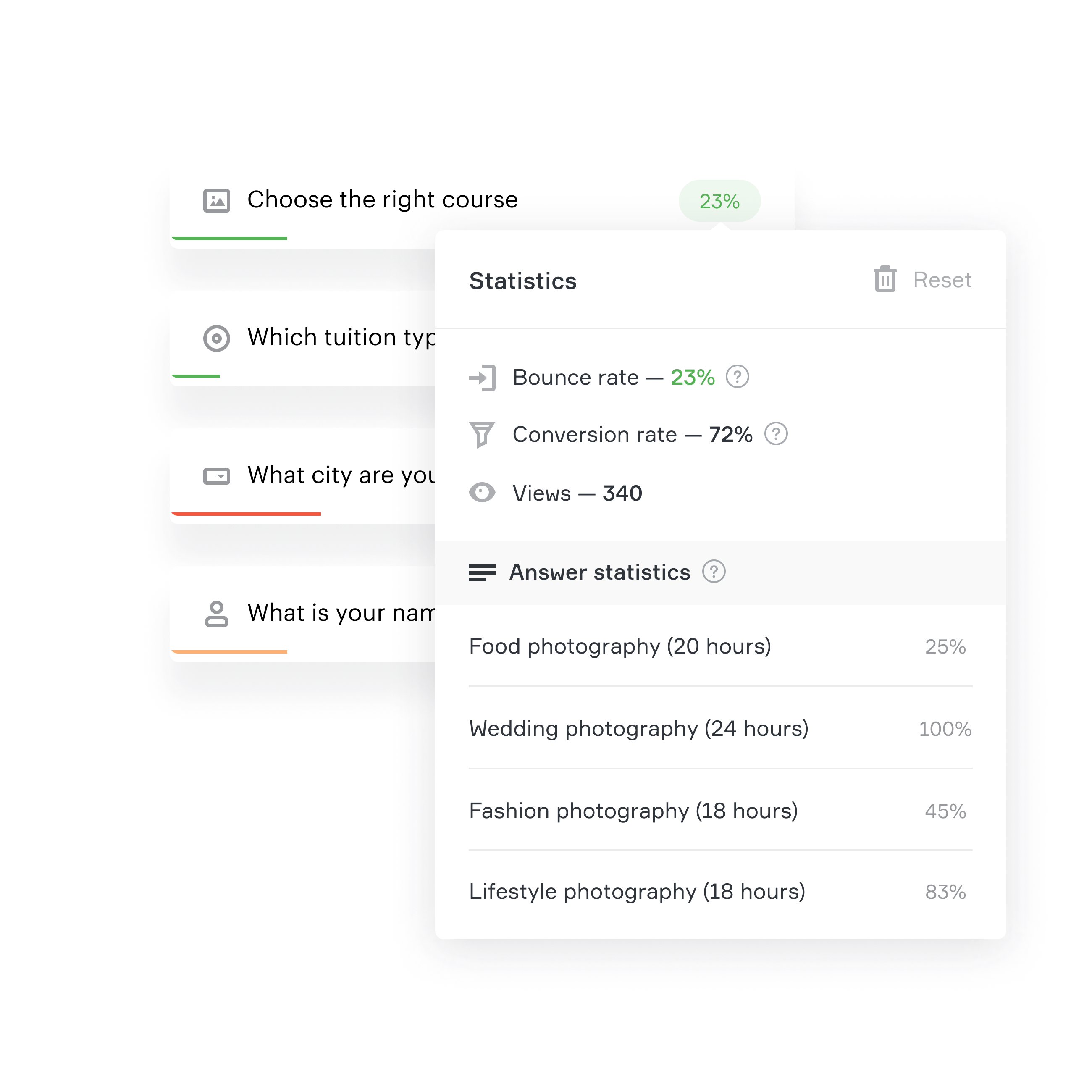 Μπορείτε να δείτε το ποσοστό εγκατάλειψης για κάθε ερώτηση και το ποσοστό επιλογής για όλες τις απαντήσεις. Αυτό βοηθά στον εντοπισμό ερωτήσεων που προκαλούν το υψηλότερο ποσοστό εγκατάλειψης.